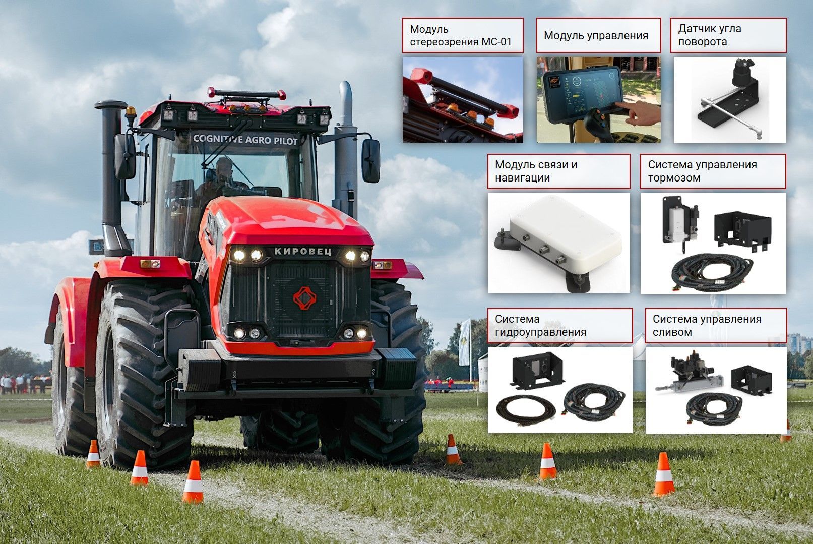 КИРОВЕЦ-АГРОПИЛОТ представляет собой программно-аппаратный комплекс на базе искусственного интеллекта, который может устанавливаться на трактора, оснащенные насосом-дозатором для программного управления углом поворота рамы. КИРОВЕЦ-АГРОПИЛОТ построена по блочно-модульному принципу исполнения технических средств автоматизации.