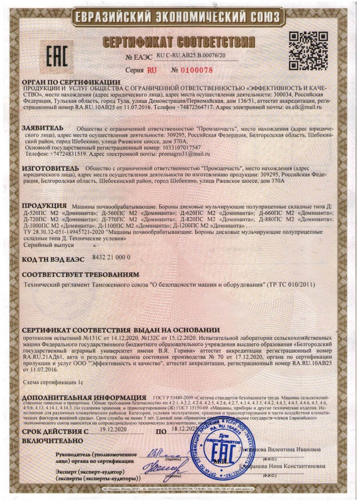 Рабочий орган: необслуживаемый пружинный блок, стойка из качественной легированной конструкционной высокоуглеродистой стали, необслуживаемый режущий узел, диск диаметром 610 мм.