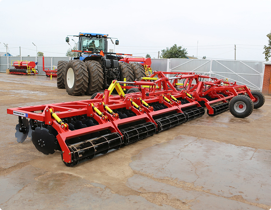 Два ряда тяжелых вырезных дисков диаметром 590 мм на индивидуальных поворотных стойках и прикатывающий каток усиленной конструкции обеспечивают интенсивную и производительную обработку почвы при любых агроклиматических условиях.